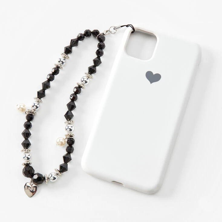 Carry your phone in style with this wrist lanyard! This lanyard has silver, black, and faux pearl beads with a “love” charm in the center.