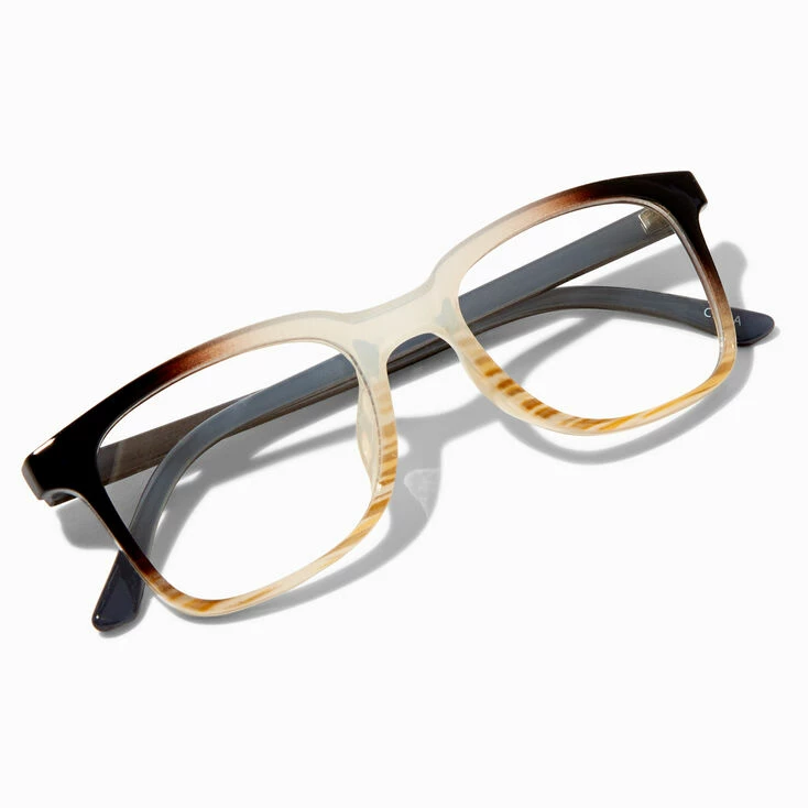 Rock the stylish glasses-wearing look without the need for a prescription! These trendy clear-lens frames feature an ombre design of brown tones that almost make them look like they have a wood-grain pattern. So cute!