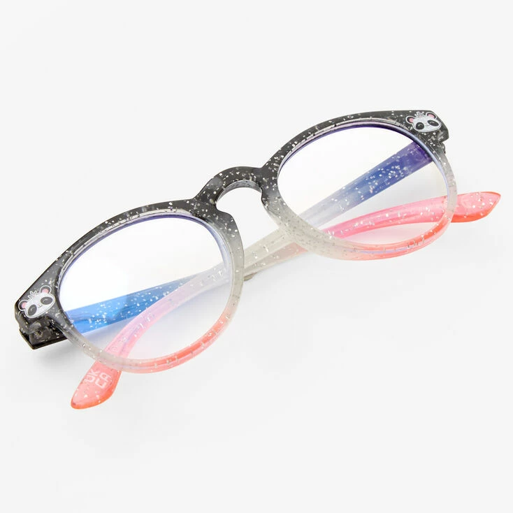 Add a pop o’ color & glitter to your look with this pair of solar blue light reducing frames. The frames have an ombre design of black to pink, with a princess panda icon on the corner of each side. Perfect for E-learning, and Tik Tok scrollin’!