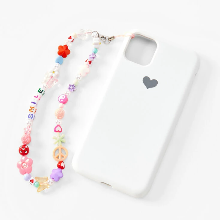 Carry your phone in style with this wrist strap! This beaded phone strap has pastel eclectic charms for a trendy & modern look.