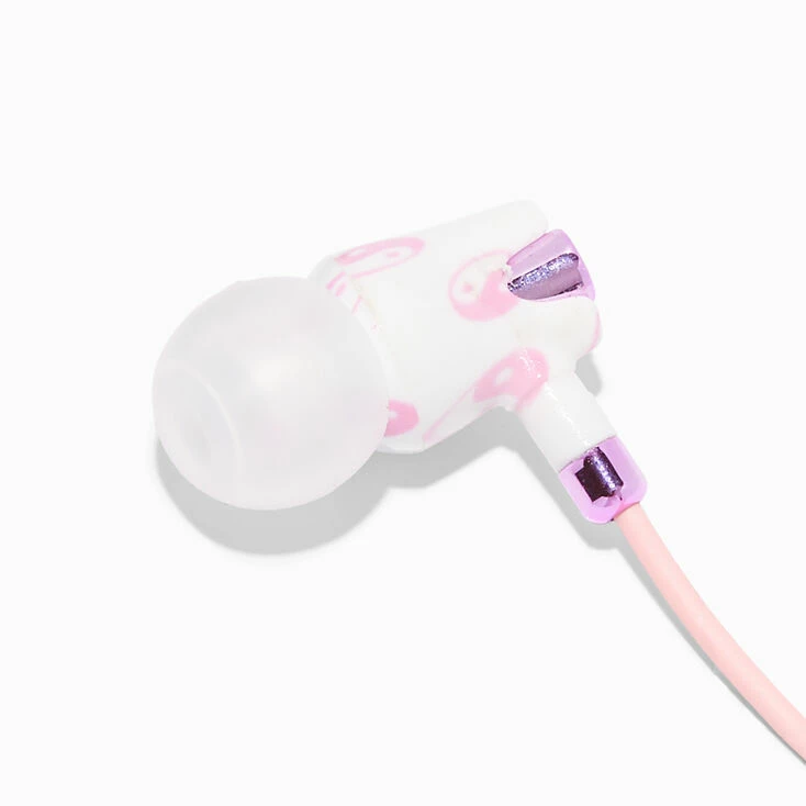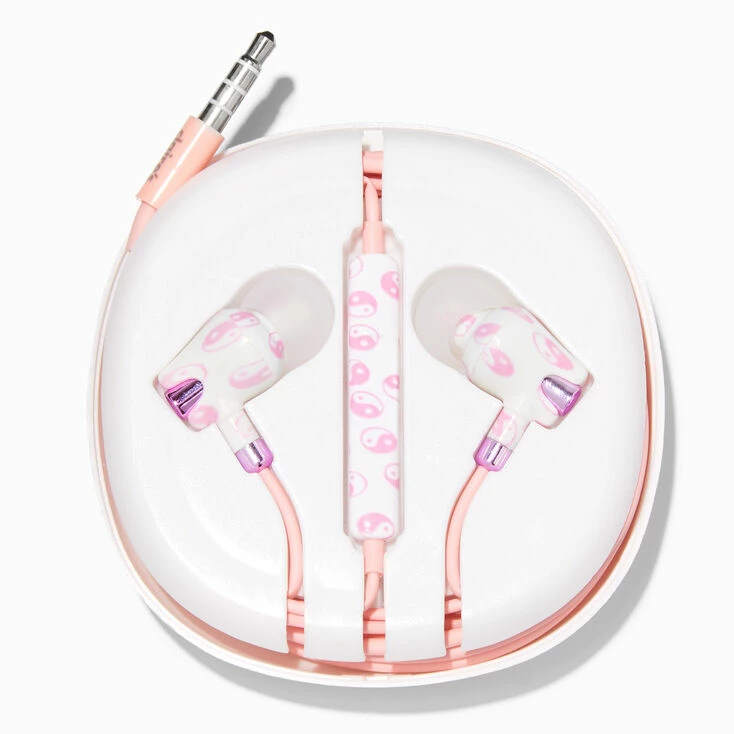 Jam out to all your favorite tunes with this pair of fun earbuds! These silicone earbuds, decorated with a traditional yin yang symbol, have a pink cord and come with a handy storage case.