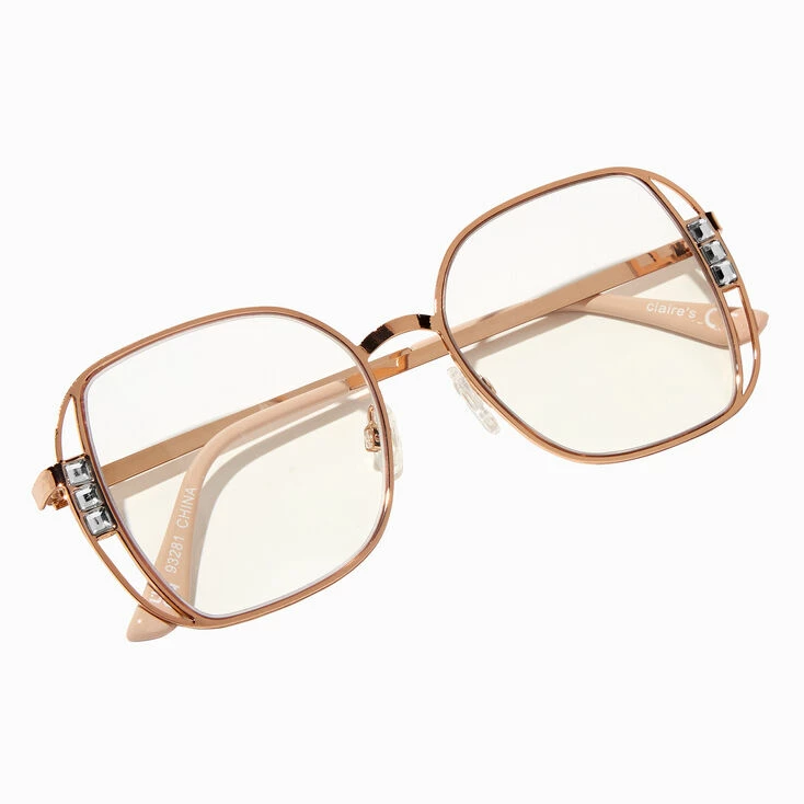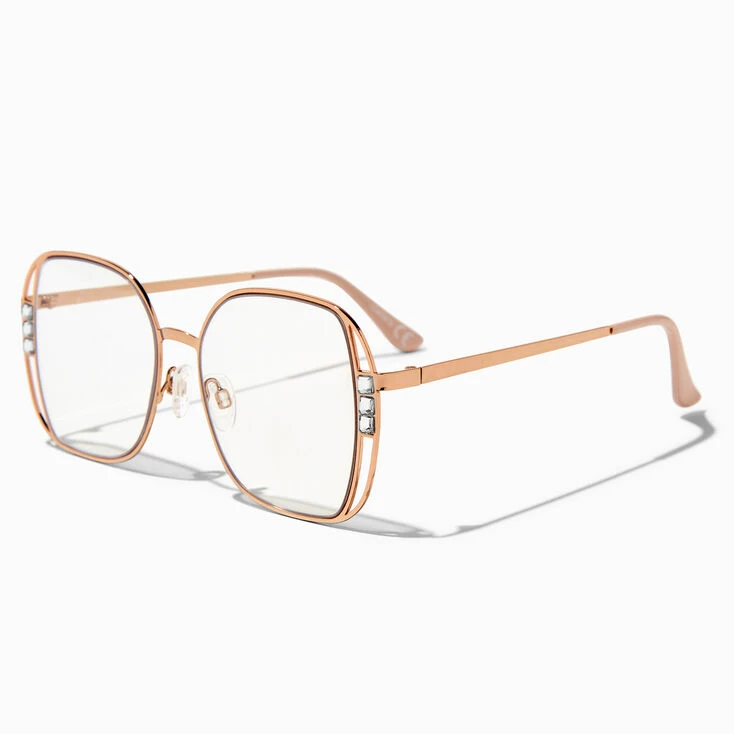 These stylish frames let you totally rock the glasses-wearing look without the need for a prescription! These square frames have a rose-gold finish and are embellished with a trio of sparkling faux crystals on each side.