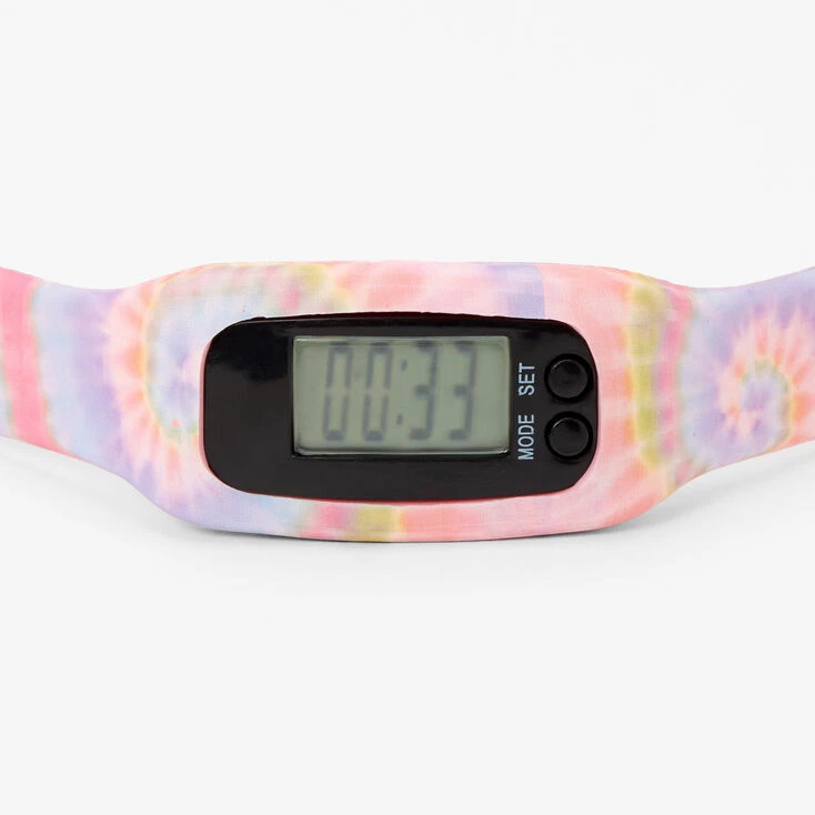 Add some color into your step with this pink, tie-dye LED watch that features a pastel tie-dye design. This active watch is equipped to provide the fitness timer everyone needs for that early morning gym sesh, as well as a standard, digital clock.