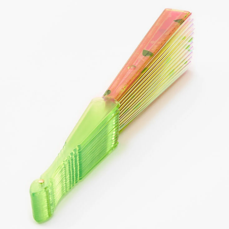 How do you keep cool at the summer picnic, or anytime you’d like to feel a little breeze? With this folding fan, featuring an iridescent slice of watermelon! Tuck it into your backpack or beach bag so it’s always handy.