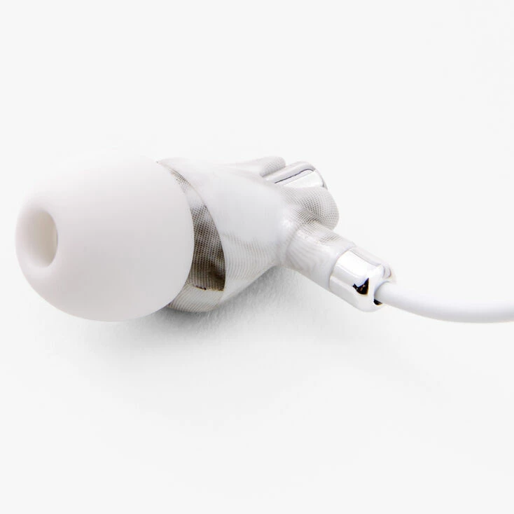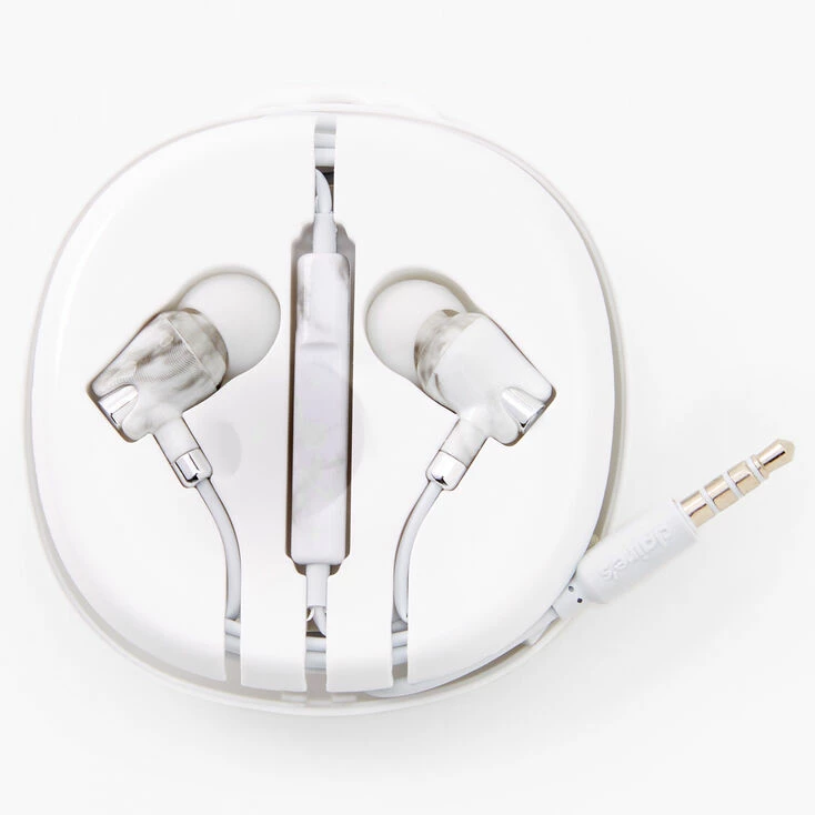Jam out to all your favorite songs with this pair of fun earbuds! These earbuds fit snug in the ear, and come with a marbled design.